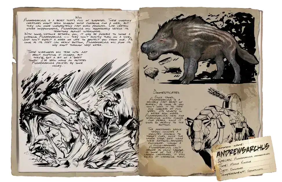 Andrewsarchus is a ARK: Survival Ascended creature that lives on the maps Fjordur.This creature eats Superior Kibble , Giant Bee Honey, Raw Mutton, Raw Prime Meat, Cooked Lamb Chop, Cooked Prime Meat, Raw Prime Fish Meat, Raw Meat, Mejoberry, Cooked Prime Fish Meat, Cooked Meat, Amarberry, Azulberry, Tintoberry, Cianberry, Magenberry, Verdberry, Cooked Fish Meat and Base Veggie.When killed, it drops the following resources: Hide and Raw Meat.It can be immobilized by Chain Bola and Large Bear Trap.It can be carried by Procoptodon, Quetzal and Tusoteuthis.It reduces the weight of the following resources Advanced Rifle Bullet by 50%.