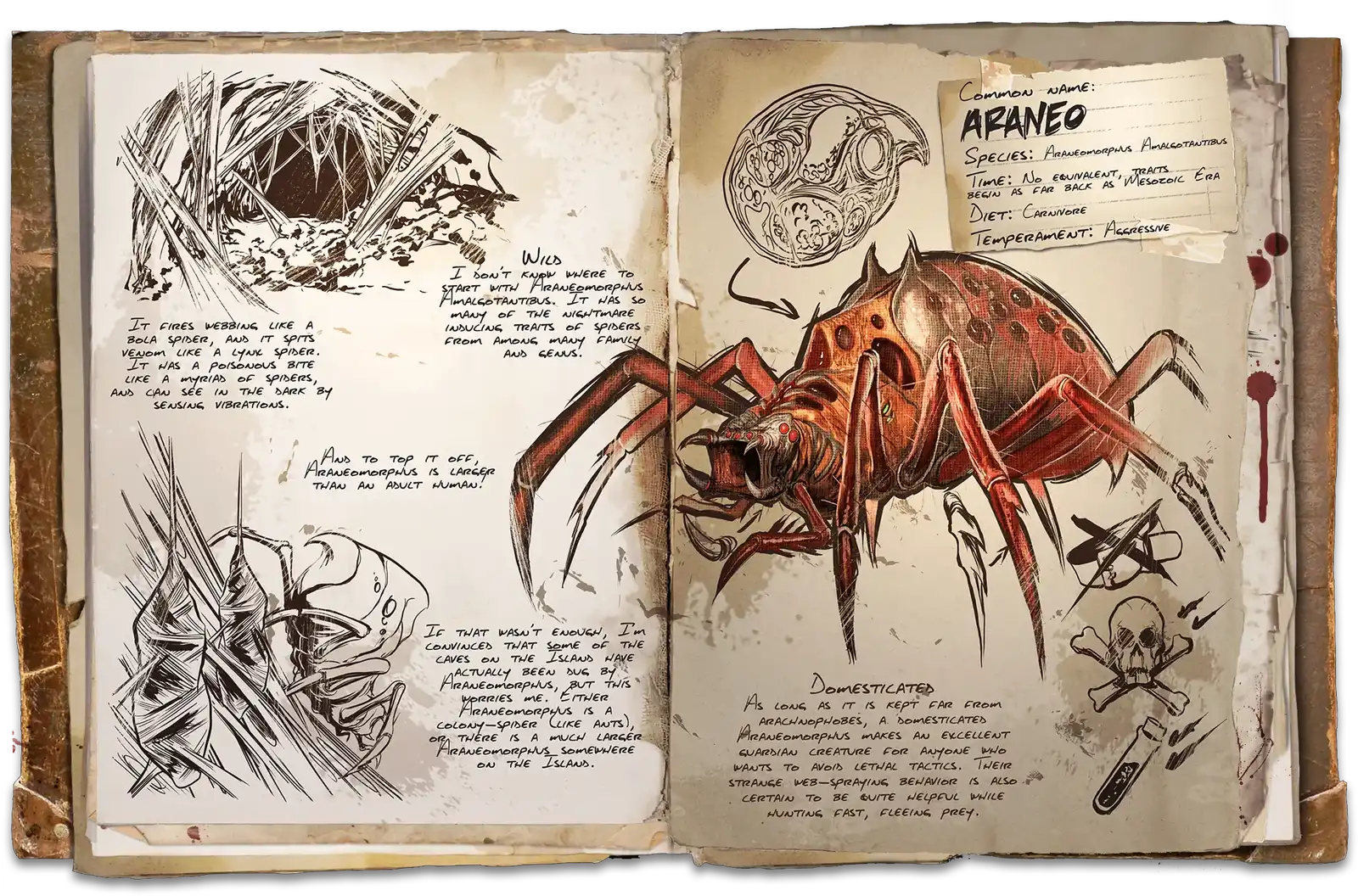 Araneo is a ARK: Survival Ascended creature that lives on the maps Valguero Ascended, Ragnarok Ascended, Astraeos, Extinction, The Island, Scorched Earth, The Center, Svartalfheim, Amissa, Insaluna, Temptress Lagoon, Reverence, Nyrandil, Althemia, Thaloria, The Volcano, Arkopolis Free, TaeniaStella, Vintal, Valguero, Ragnarok, Crystal Isles, Lost Island, Fjordur, Genesis and Genesis 2.This creature eats Spoiled Meat, Cooked Lamb Chop, Raw Meat and Cooked Prime Fish Meat.When killed, it drops the following resources: Chitin and Raw Meat.It can be immobilized by Bola and Bear Trap.It can be carried by Argentavis, Gigantopithecus, Desmodus, Karkinos, Megalosaurus, Kaprosuchus, Megalosaurus, Procoptodon, Quetzal and Tusoteuthis.