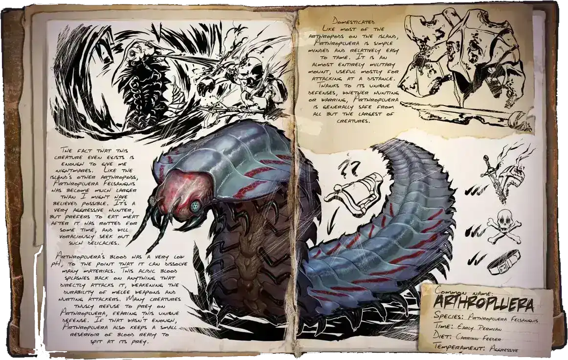 Arthropluera is a ARK: Survival Ascended creature that lives on the maps Valguero Ascended, Ragnarok Ascended, Astraeos, Extinction, Aberration, The Island, Scorched Earth, The Center, Svartalfheim, Amissa, Insaluna, Temptress Lagoon, Reverence, Nyrandil, Althemia, Thaloria, The Volcano, Arkopolis Free, TaeniaStella, Vintal, Valguero, Ragnarok, Crystal Isles, Lost Island, Fjordur, Genesis and Genesis 2.This creature eats Broth of Enlightenment, Spoiled Meat, Cooked Lamb Chop, Raw Meat and Cooked Prime Fish Meat.When killed, it drops the following resources: Chitin and Raw Meat.It can be carried by Argentavis, Gigantopithecus, Desmodus, Karkinos, Megalosaurus, Megalosaurus, Procoptodon, Quetzal and Tusoteuthis.