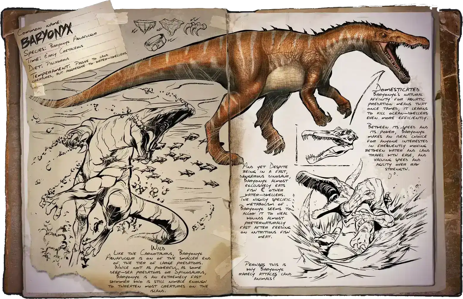 Baryonyx is a ARK: Survival Ascended creature that lives on the maps Valguero Ascended, Ragnarok Ascended, Astraeos, Extinction, Aberration, The Island, The Center, Svartalfheim, Amissa, Insaluna, Temptress Lagoon, Reverence, Nyrandil, Althemia, Thaloria, The Volcano, Arkopolis Free, TaeniaStella, Vintal, Valguero, Ragnarok, Crystal Isles, Lost Island, Fjordur, Genesis and Genesis 2.This creature eats Regular Kibble , Raw Mutton, Cooked Lamb Chop, Raw Prime Fish Meat, Cooked Prime Fish Meat, Raw Fish Meat and Cooked Fish Meat.When killed, it drops the following resources: Hide and Raw Meat.It can be immobilized by Chain Bola, Bear Trap, Large Bear Trap and Plant Species Y.It can be carried by Karkinos, Procoptodon, Quetzal and Tusoteuthis.