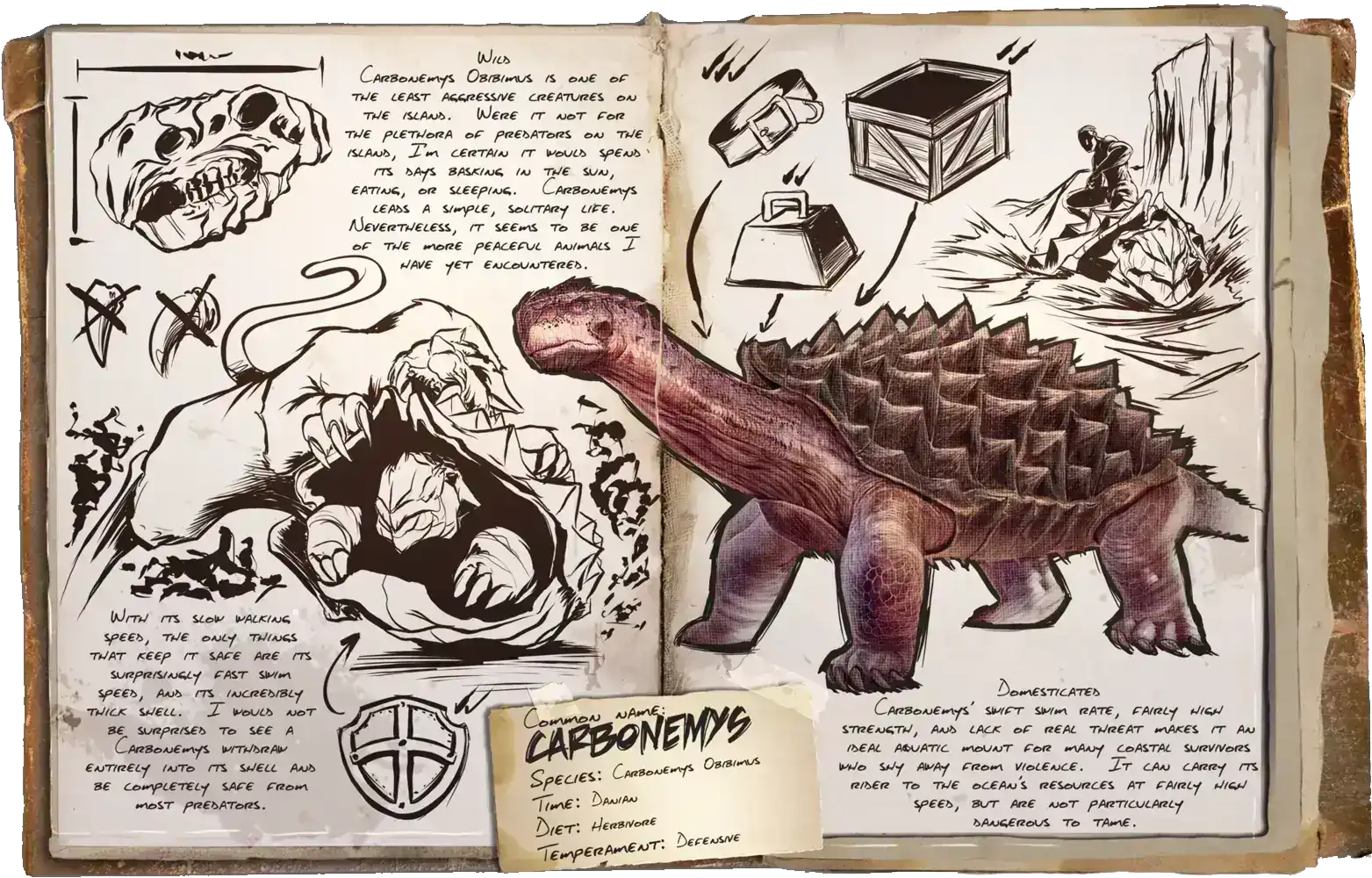 Carbonemys is a ARK: Survival Ascended creature that lives on the maps Valguero Ascended, Ragnarok Ascended, Astraeos, Extinction, Aberration, The Island, The Center, Svartalfheim, Amissa, Insaluna, Temptress Lagoon, Reverence, Nyrandil, Althemia, Thaloria, The Volcano, Arkopolis Free, TaeniaStella, Vintal, Valguero, Ragnarok, Crystal Isles, Lost Island, Fjordur, Genesis and Genesis 2.This creature eats Regular Kibble , Base Veggie, Mejoberry, Amarberry, Azulberry, Tintoberry, Cianberry, Magenberry, Verdberry, Stimberry and Sweet Vegetable Cake.When killed, it drops the following resources: Hide, Raw Meat and Keratin.It can be immobilized by Chain Bola, Large Bear Trap and Plant Species Y.It can be carried by Procoptodon, Quetzal and Tusoteuthis.