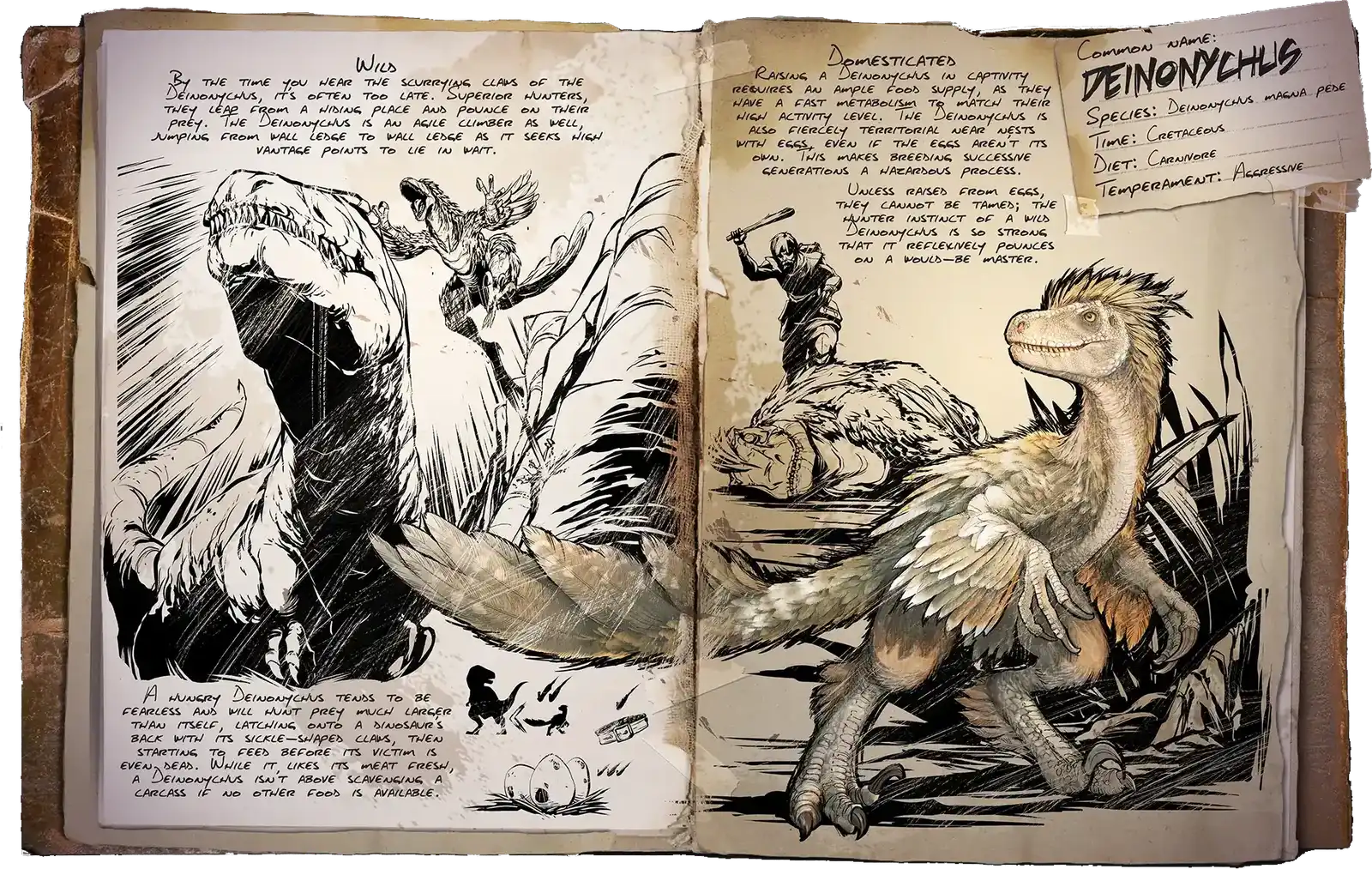 Deinonychus is a ARK: Survival Ascended creature that lives on the maps Temptress Lagoon, Valguero and Fjordur.This creature eats Simple Kibble , Raw Mutton, Raw Prime Meat, Cooked Lamb Chop, Cooked Prime Meat, Raw Prime Fish Meat, Raw Meat, Cooked Prime Fish Meat, Cooked Meat and Cooked Fish Meat.When killed, it drops the following resources: Hide and Raw Meat.It can be immobilized by Bola, Bear Trap and Plant Species Y.It can be carried by Argentavis, Gigantopithecus, Desmodus, Karkinos, Megalosaurus, Kaprosuchus, Megalosaurus, Procoptodon, Quetzal and Tusoteuthis.