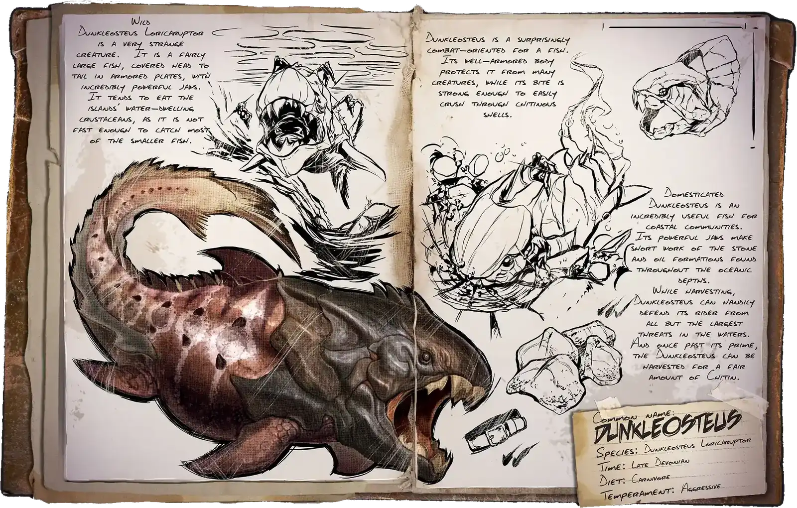 Dunkleosteus is a ARK: Survival Ascended creature that lives on the maps Valguero Ascended, Ragnarok Ascended, Astraeos, The Island, The Center, Svartalfheim, Amissa, Insaluna, Temptress Lagoon, Reverence, Nyrandil, Althemia, Thaloria, The Volcano, Arkopolis Free, TaeniaStella, Vintal, Valguero, Ragnarok, Crystal Isles, Lost Island, Fjordur, Genesis and Genesis 2.This creature eats Superior Kibble , Raw Mutton, Raw Prime Meat, Cooked Lamb Chop, Cooked Prime Meat, Raw Prime Fish Meat, Raw Meat, Cooked Prime Fish Meat, Cooked Meat and Cooked Fish Meat.When killed, it drops the following resources: Raw Fish Meat, Chitin and Raw Prime Fish Meat.It reduces the weight of the following resources Metal by 50%, Stone by 50%, Obsidian by 75%, Crystal by 50%, Black Pearl by 50%, Oil by 50%.