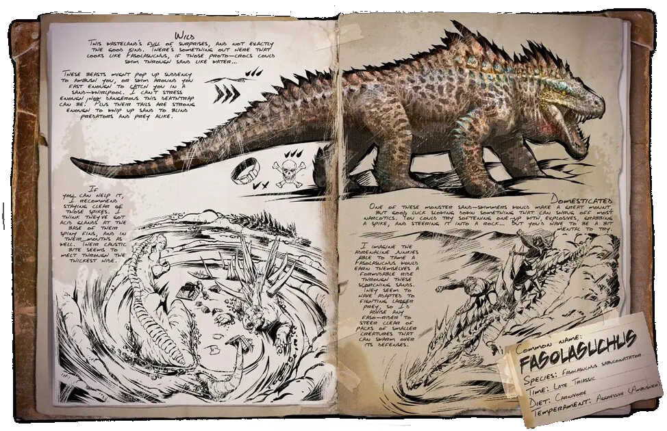 Fasolasuchus is a ARK: Survival Ascended creature that lives on the maps Astraeos, Scorched Earth, Amissa and Temptress Lagoon.This creature eats Exceptional Kibble , Raw Mutton, Raw Prime Meat, Cooked Lamb Chop, Cooked Prime Meat, Raw Prime Fish Meat, Raw Meat, Cooked Prime Fish Meat, Cooked Meat and Cooked Fish Meat.When killed, it drops the following resources: Hide, Raw Meat, Raw Prime Meat and Keratin.It can be immobilized by Chain Bola and Large Bear Trap.It can be carried by Procoptodon and Tusoteuthis.