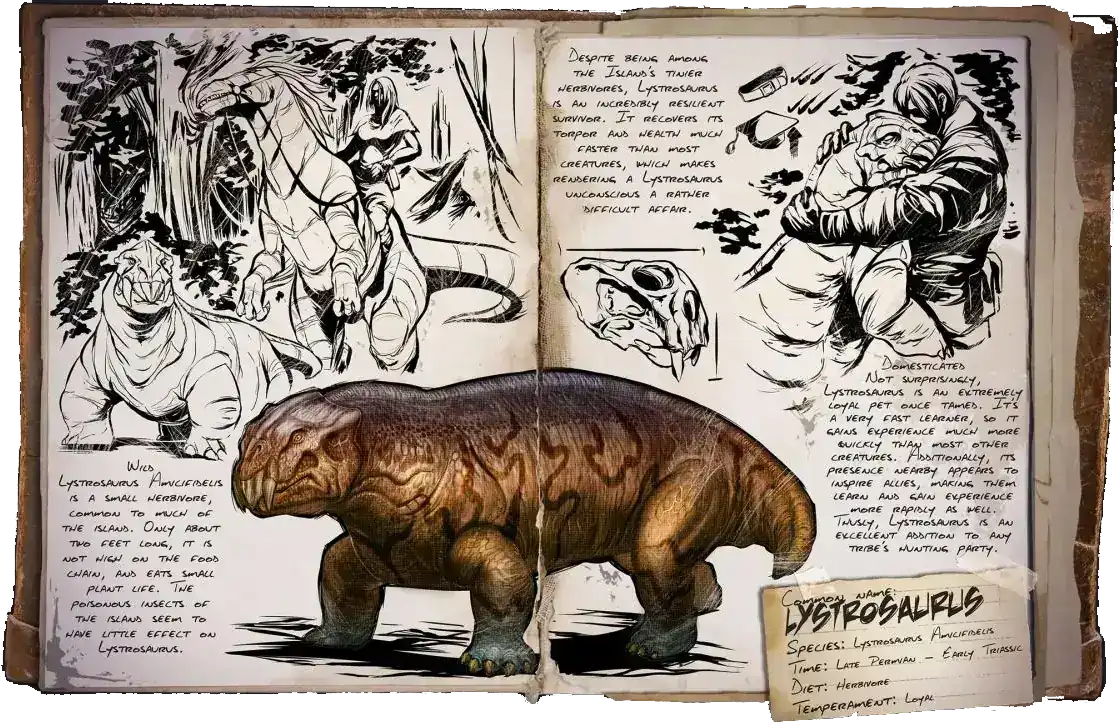 Lystrosaurus is a ARK: Survival Ascended creature that lives on the maps Valguero Ascended, Ragnarok Ascended, Astraeos, Extinction, Aberration, The Island, Scorched Earth, The Center, Svartalfheim, Amissa, Insaluna, Temptress Lagoon, Reverence, Nyrandil, Althemia, Thaloria, The Volcano, Arkopolis Free, TaeniaStella, Vintal, Valguero, Ragnarok, Crystal Isles, Lost Island, Fjordur, Genesis and Genesis 2.This creature eats Rare Flower, Base Veggie, Mejoberry, Amarberry, Azulberry, Tintoberry, Cianberry, Magenberry, Verdberry and Stimberry.When killed, it drops the following resources: Hide and Raw Meat.It can be immobilized by Bola, Bear Trap and Plant Species Y.It can be carried by Argentavis, Gigantopithecus, Desmodus, Griffin, Karkinos, Megalosaurus, Tropeognathus, Kaprosuchus, Megalosaurus, Procoptodon, Pteranodon, Quetzal, Tapejara and Tusoteuthis.
