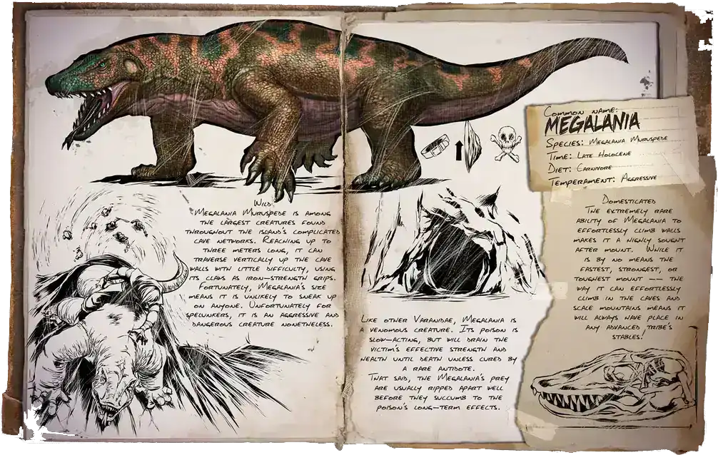 Megalania is a ARK: Survival Ascended creature that lives on the maps Valguero Ascended, Ragnarok Ascended, Astraeos, Extinction, Aberration, The Island, Scorched Earth, The Center, Svartalfheim, Amissa, Insaluna, Temptress Lagoon, Reverence, Nyrandil, Althemia, Thaloria, The Volcano, Arkopolis Free, TaeniaStella, Vintal, Ragnarok, Crystal Isles, Lost Island, Fjordur and Genesis.This creature eats Extraordinary Kibble , Raw Mutton, Raw Prime Meat, Cooked Lamb Chop, Cooked Prime Meat, Raw Prime Fish Meat, Raw Meat, Cooked Prime Fish Meat, Cooked Meat and Cooked Fish Meat.When killed, it drops the following resources: Hide and Raw Meat.It can be immobilized by Bola, Bear Trap and Plant Species Y.It can be carried by Argentavis, Gigantopithecus, Desmodus, Griffin, Karkinos, Megalosaurus, Tropeognathus, Kaprosuchus, Megalosaurus, Procoptodon, Pteranodon, Quetzal, Tapejara and Tusoteuthis.
