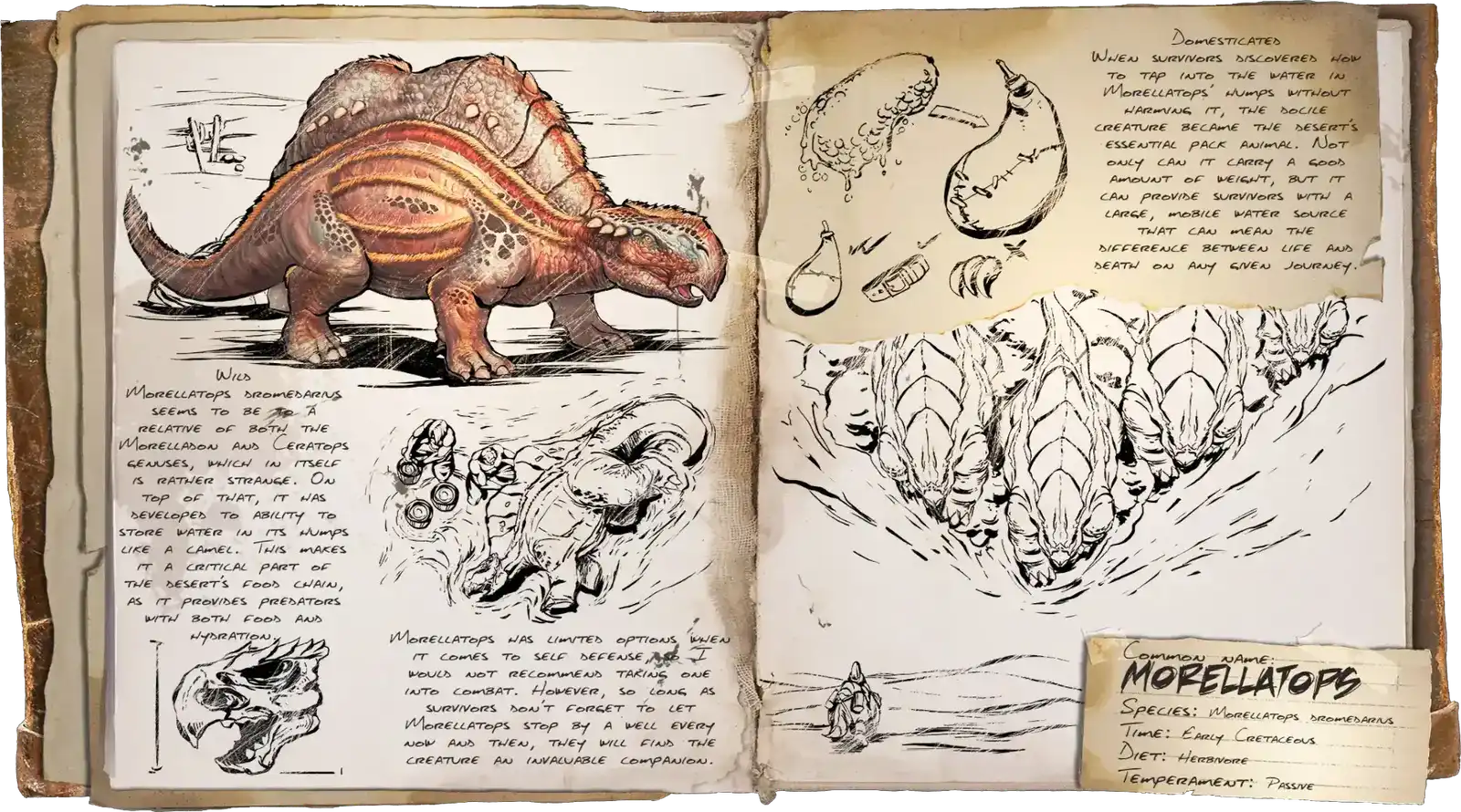 Morellatops is a ARK: Survival Ascended creature that lives on the maps Astraeos, Extinction, Scorched Earth, Amissa, Temptress Lagoon, Ragnarok, Crystal Isles and Lost Island.This creature eats Simple Kibble , Base Veggie, Cactus Sap, Mejoberry, Amarberry, Azulberry, Tintoberry, Cianberry, Magenberry, Verdberry, Stimberry and Sweet Vegetable Cake.When killed, it drops the following resources: Hide and Raw Meat.It can be immobilized by Chain Bola and Large Bear Trap.It can be carried by Procoptodon, Quetzal and Tusoteuthis.