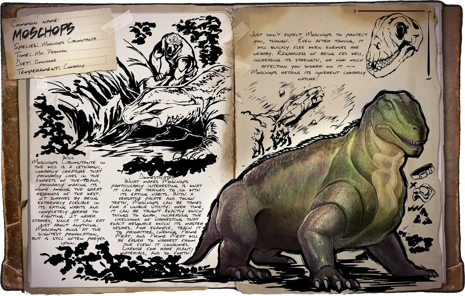 Moschops is a ARK: Survival Ascended creature that lives on the maps Valguero Ascended, Ragnarok Ascended, Astraeos, Extinction, Aberration, The Island, Scorched Earth, The Center, Svartalfheim, Amissa, Insaluna, Temptress Lagoon, Reverence, Nyrandil, Althemia, Thaloria, The Volcano, Arkopolis Free, TaeniaStella, Vintal, Valguero, Ragnarok, Crystal Isles, Lost Island, Fjordur, Genesis and Genesis 2.This creature eats ****.When killed, it drops the following resources: Hide and Raw Meat.It can be immobilized by Bola.It can be carried by Argentavis, Gigantopithecus, Desmodus, Karkinos, Megalosaurus, Kaprosuchus, Megalosaurus, Procoptodon, Quetzal and Tusoteuthis.