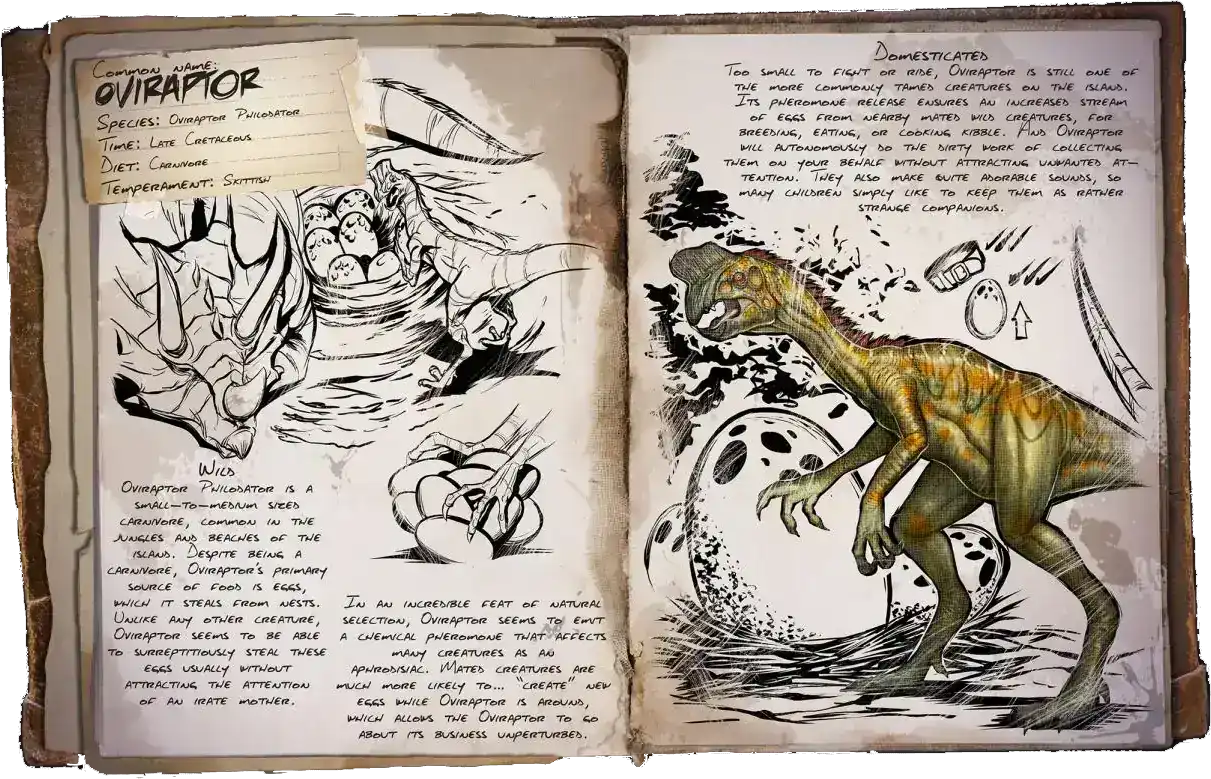 Oviraptor is a ARK: Survival Ascended creature that lives on the maps Valguero Ascended, Ragnarok Ascended, Astraeos, Extinction, The Island, The Center, Svartalfheim, Amissa, Insaluna, Temptress Lagoon, Reverence, Nyrandil, Althemia, Thaloria, The Volcano, Arkopolis Free, TaeniaStella, Vintal, Valguero, Ragnarok, Crystal Isles, Lost Island, Fjordur, Genesis and Genesis 2.This creature eats Extraordinary Dinosaur Egg, Exceptional Dinosaur Egg, Superior Dinosaur Egg, Regular Dinosaur Egg, Simple Dinosaur Egg, Basic Dinosaur Egg and Dinosaur Egg.When killed, it drops the following resources: Hide and Raw Meat.It can be immobilized by Bola, Bear Trap and Plant Species Y.It can be carried by Argentavis, Gigantopithecus, Desmodus, Griffin, Karkinos, Megalosaurus, Kaprosuchus, Megalosaurus, Procoptodon, Pteranodon, Quetzal and Tusoteuthis.
