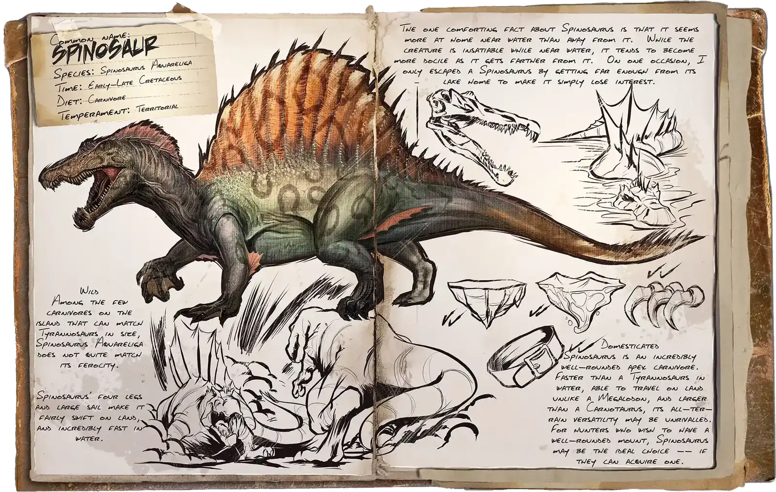 Spino is a ARK: Survival Ascended creature that lives on the maps Valguero Ascended, Ragnarok Ascended, Astraeos, Extinction, Aberration, The Island, The Center, Svartalfheim, Amissa, Insaluna, Temptress Lagoon, Reverence, Nyrandil, Althemia, Thaloria, The Volcano, Arkopolis Free, TaeniaStella, Vintal, Valguero, Ragnarok, Crystal Isles, Lost Island, Fjordur, Genesis and Genesis 2.This creature eats Exceptional Kibble , Raw Prime Fish Meat, Raw Mutton, Raw Prime Meat, Cooked Lamb Chop, Cooked Prime Fish Meat, Cooked Prime Meat, Raw Fish Meat, Raw Meat, Cooked Fish Meat and Cooked Meat.When killed, it drops the following resources: Hide, Raw Meat and Raw Prime Meat.It can be immobilized by Chain Bola and Large Bear Trap.It can be carried by Procoptodon and Tusoteuthis.