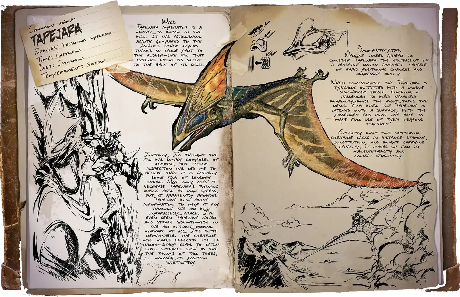 Tapejara is a ARK: Survival Ascended creature that lives on the maps Astraeos, Extinction, Svartalfheim, Amissa, Valguero, Ragnarok, Crystal Isles, Lost Island, Fjordur and Genesis 2.This creature eats Superior Kibble , Raw Mutton, Raw Prime Meat, Cooked Lamb Chop, Cooked Prime Meat, Raw Prime Fish Meat, Raw Meat, Cooked Prime Fish Meat, Cooked Meat and Cooked Fish Meat.When killed, it drops the following resources: Hide and Raw Meat.It can be immobilized by Bola, Chain Bola, Bear Trap and Plant Species Y.