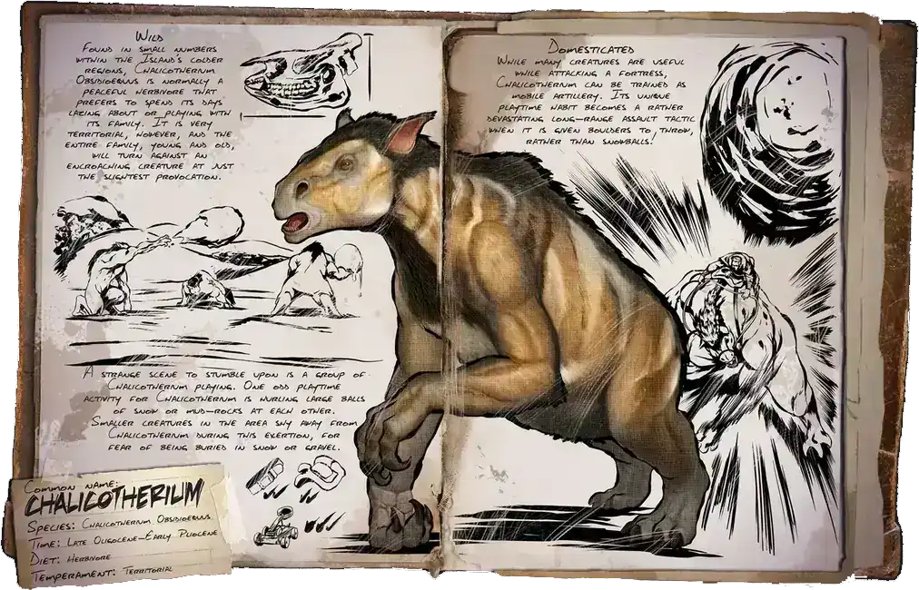 Chalikotherium ist ein Lebewesen aus ARK: Survival Ascended, das auf den Karten Valguero Ascended, Ragnarok Ascended, Astraeos, Extinction, The Island, The Center, Svartalfheim, Amissa, Insaluna, Temptress Lagoon, Reverence, Nyrandil, Althemia, Thaloria, The Volcano, Arkopolis Free, TaeniaStella, Vintal, Valguero, Ragnarok, Crystal Isles, Lost Island, Fjordur, Genesis and Genesis 2 lebt.Dieses Lebewesen frisst Bierkrug and Stimbeere.Beim Töten lässt es folgende Ressourcen fallen: Leder, Rohes Fleisch and Rohes Filet.Es kann durch Chain Bola, Large Bear Trap and Plant Species Y immobilisiert werden.Es kann von Procptodon, Quetzal and Tusoteuthis getragen werden.