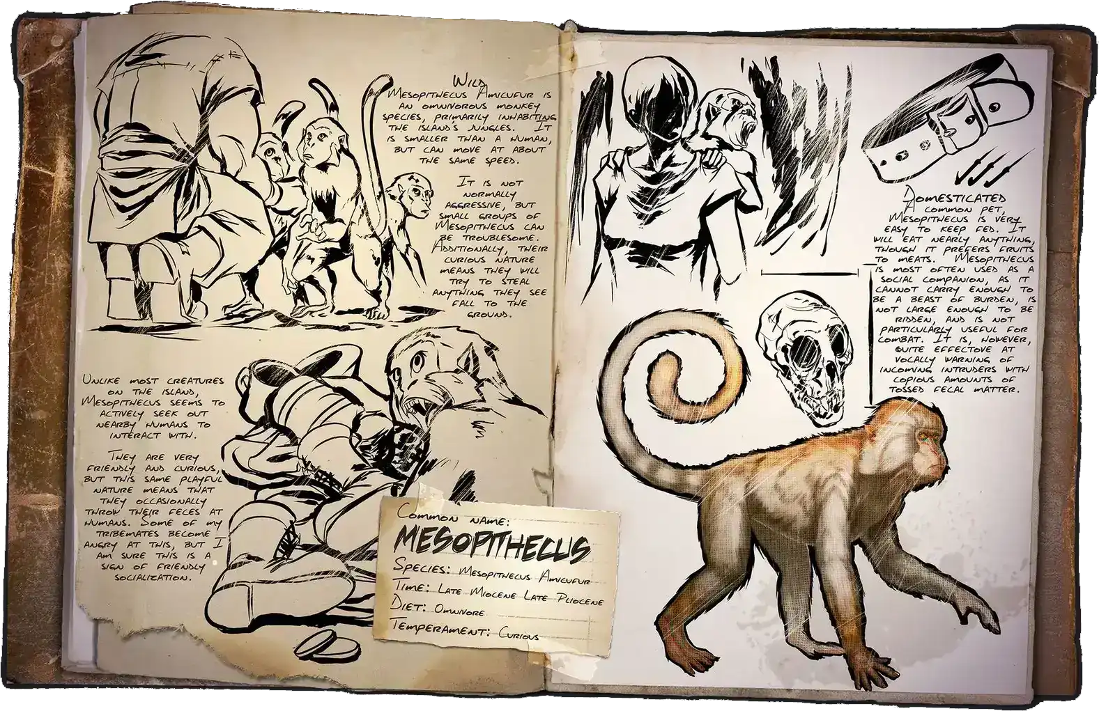 Mesopithecus ist ein Lebewesen aus ARK: Survival Ascended, das auf den Karten Valguero Ascended, Ragnarok Ascended, Astraeos, Extinction, The Island, The Center, Svartalfheim, Amissa, Insaluna, Temptress Lagoon, Reverence, Nyrandil, Althemia, Thaloria, The Volcano, Arkopolis Free, TaeniaStella, Vintal, Valguero, Ragnarok, Crystal Isles, Lost Island, Fjordur, Genesis and Genesis 2 lebt.Dieses Lebewesen frisst Kibble, Basisgemüse, Mejobeere, Amarbeere, Azulbeere, Tintobeere, Cianberry, Magenberry, Verdberry, Stimbeere and Süßer Gemüsekuchen.Beim Töten lässt es folgende Ressourcen fallen: Leder and Rohes Fleisch.Es kann durch Bola, Bear Trap and Plant Species Y immobilisiert werden.Es kann von Silber, Gigantopithecus, Desmodus, Greif, Karkinos, Megalasaurus, Tropoghus, Caprosuchus, Megalasaurus, Procptodon, Pteranodon, Quetzal, Tapejara and Tusoteuthis getragen werden.