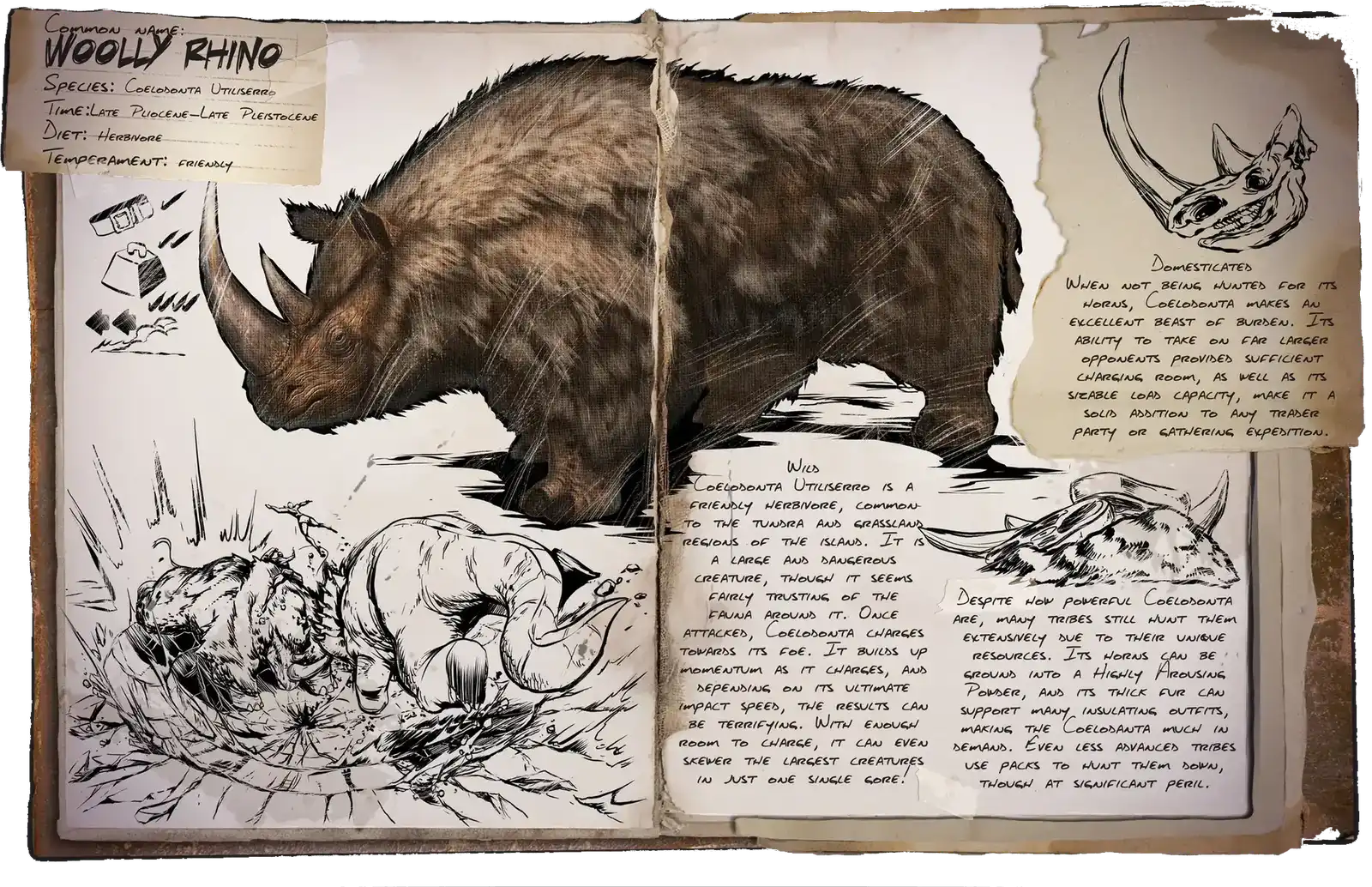Dies sind Gegenstände, die ein Woll Rhino bei Tod in ARK als Beute und Ressourcen fallen lässt.