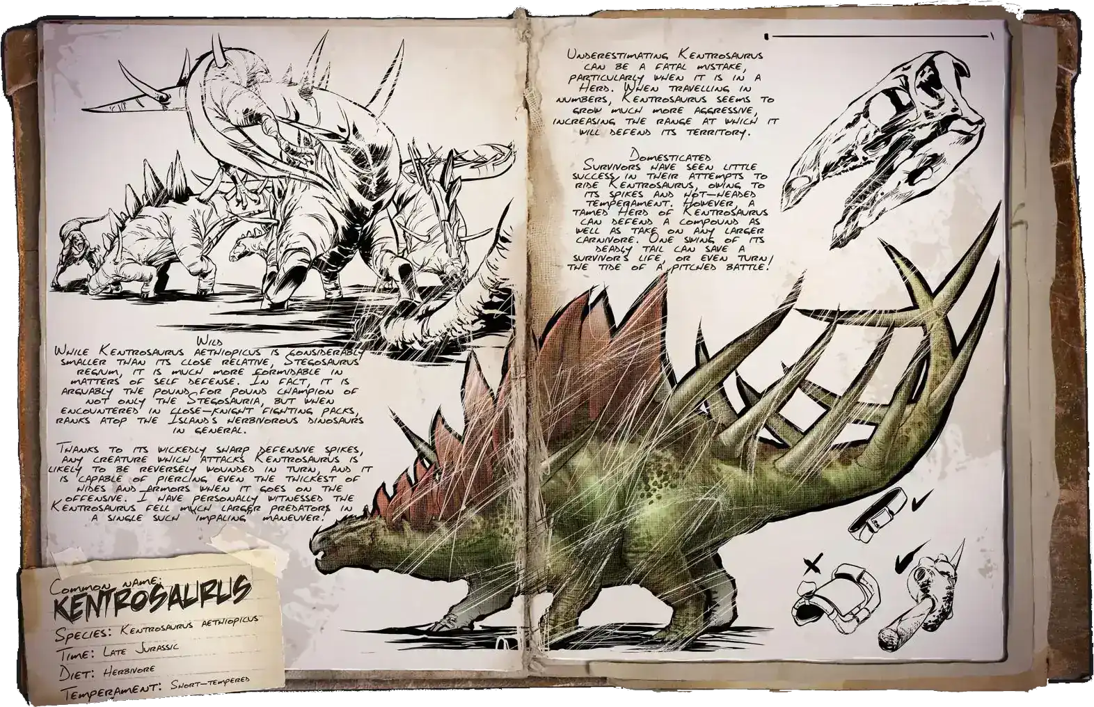 Kentrosaurio es una criatura de ARK: Survival Ascended que vive en los mapas Valguero Ascended, Ragnarok Ascended, Astraeos, Extinction, The Island, Scorched Earth, The Center, Svartalfheim, Amissa, Insaluna, Temptress Lagoon, Reverence, Nyrandil, Althemia, Thaloria, The Volcano, Arkopolis Free, TaeniaStella, Vintal, Valguero, Ragnarok, Crystal Isles, Lost Island, Fjordur, Genesis and Genesis 2.Esta criatura se alimenta de Pienso normal , Verduras básicas, Baya morada, Baya azul, Baya roja, Baya amarilla, Cianberry, Magenberry, Verdberry, Baya estimulante and Pastel dulce de vegetales.Cuando es asesinada, suelta los siguientes recursos: Piel, Carne cruda and Queratina.Puede ser inmovilizada por Chain Bola, Bear Trap, Large Bear Trap and Plant Species Y.Puede ser transportada por Procoptodon, Quetzal and Tusoteuthis.