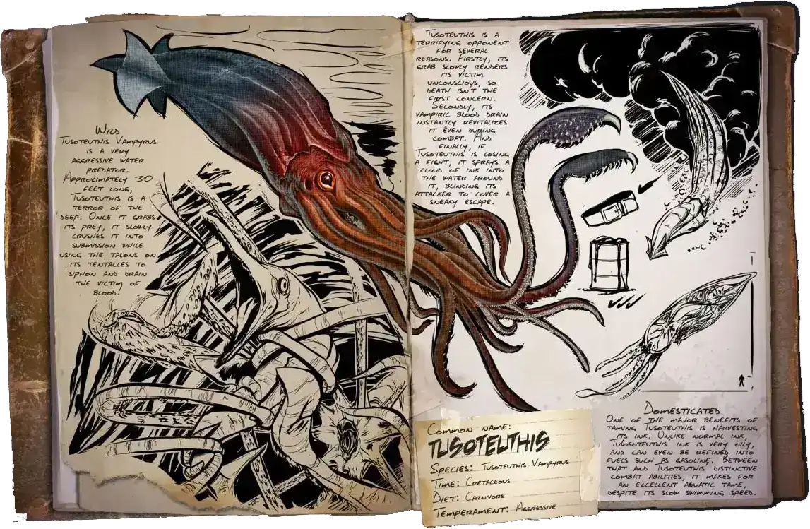 Tusoteuthis es una criatura de ARK: Survival Ascended que vive en los mapas Valguero Ascended, Ragnarok Ascended, Astraeos, The Island, The Center, Svartalfheim, Amissa, Insaluna, Temptress Lagoon, Reverence, Nyrandil, Althemia, Thaloria, The Volcano, Arkopolis Free, TaeniaStella, Vintal, Valguero, Ragnarok, Crystal Isles, Lost Island, Fjordur, Genesis and Genesis 2.Esta criatura se alimenta de Perla negra, Cordero crudo, Carne de primera cruda, Chuleta de cordero cocinada, Carne de primera cocinada, Pescado de primera crudo, Carne cruda, Pescado de primera cocinado, Carne cocinada and Pescado cocinado.Cuando es asesinada, suelta los siguientes recursos: Pescado crudo, Pescado de primera crudo and Queratina.