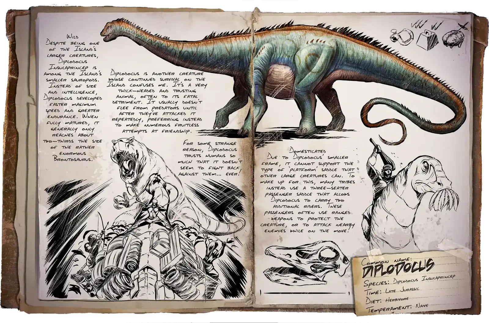 Diplodocus est une créature de ARK: Survival Ascended qui vit sur les cartes Valguero Ascended, Ragnarok Ascended, Astraeos, Extinction, Aberration, The Island, The Center, Svartalfheim, Amissa, Insaluna, Temptress Lagoon, Reverence, Nyrandil, Althemia, Thaloria, The Volcano, Arkopolis Free, TaeniaStella, Vintal, Valguero, Ragnarok, Crystal Isles, Lost Island, Fjordur and Genesis 2.Cette créature mange Croquette Régulière , Légume ordinaire, Mejoberry, Amarberry, Azulberry, Tintoberry, Cianberry, Magenberry, Verdberry, Stimulant and Délicieux gâteau aux légumes.Quand elle est tuée, elle laisse tomber les ressources suivantes : Peau, Viande crue and Viande supérieure crue.Elle peut être immobilisée par Chain Bola and Large Bear Trap.Elle peut être portée par Procoptodon and Tusoteuthis.