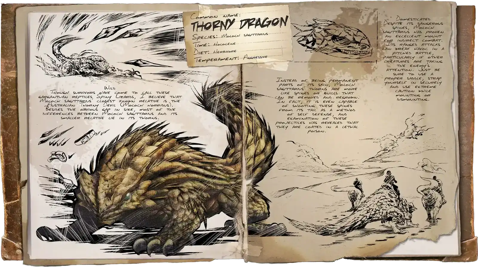 Lézard épineux est une créature de ARK: Survival Ascended qui vit sur les cartes Astraeos, Extinction, Scorched Earth, Amissa, Temptress Lagoon, Ragnarok, Crystal Isles, Lost Island, Fjordur, Genesis and Genesis 2.Cette créature mange Croquette Régulière , Viande de mouton, Viande supérieure crue, Côtelette d'agneau cuite, Viande cuite supérieure, Chair de poisson supérieure crue, Viande crue, Chair cuite de poisson supérieure, Viande cuite and Chair cuite de poisson.Quand elle est tuée, elle laisse tomber les ressources suivantes : Kératine, Viande crue and Peau.Elle peut être immobilisée par Chain Bola, Bear Trap, Large Bear Trap and Plant Species Y.Elle peut être portée par Gigantopithèque, Karkinos, Procoptodon, Quetzal and Tusoteuthis.Elle réduit le poids des ressources suivantes Bois by 50%, Fibres by 50%, Branchages by 50%, Pierre by 50%.